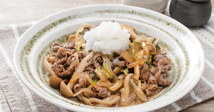 玉ねぎ、青ネギ、ぶなしめじ、国産牛こまぎれ肉、大根おろし、味付けぽん酢