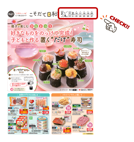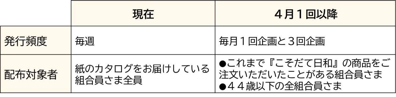 現在は、毎週・すべての組合員様に紙で発行した「こそだて日和」カタログを配布していますが、4月1回以降は下記の通り変更いたします。