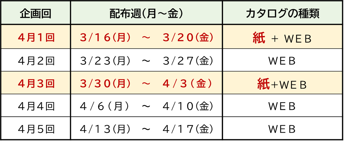 紙のカタログがお手元に届かない週(2回・4回・5回)も、WEBカタログやネット限定の企画を毎週更新中!