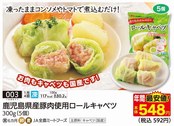 • 原料にこだわり、旨味のある鹿児島県産の豚肉と、国産のキャベツを使用してロールキャベツを作りました。