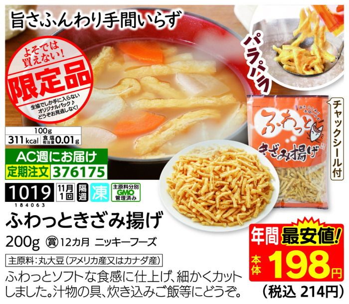- ふんわり食感の油揚げを食べやすく刻んだ便利な一品です。みそ汁やうどんの具材はもちろん、煮物や炒め物にもよく味がしみ込み、毎日の料理に幅広くお使いいただけます。