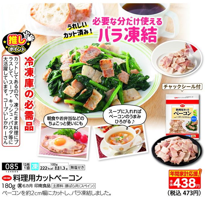 - CO・OP料理用カットベーコン(チャックシール付き) 180g(コープ商品サイト)