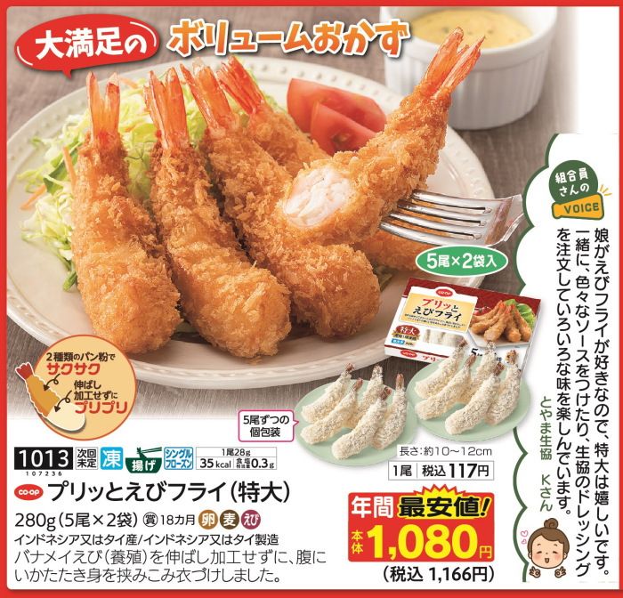 - CO・OPプリッとえびフライ(特大)280g 5尾×2袋(コープ商品サイト)