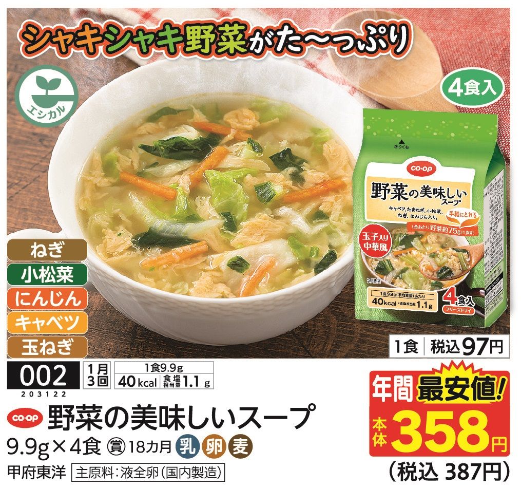 - CO・OP野菜の美味しいスープ(玉子入り中華風) 4食入(コープ商品サイト)